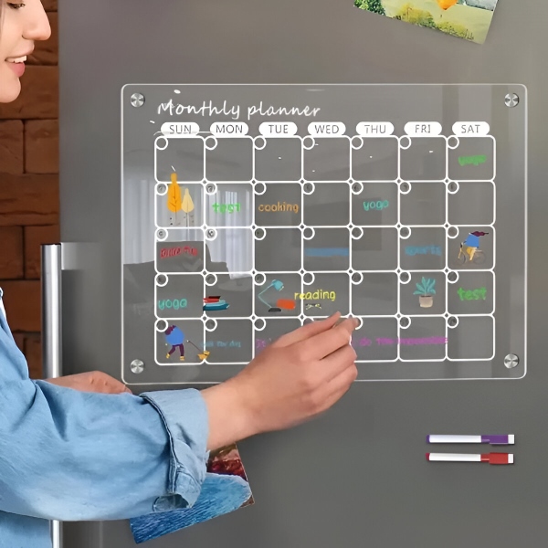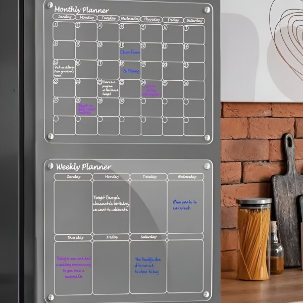 Akrylová súprava kalendárov na chladničku – Mesačný + týždenný plánovač (každý 40 x 30 cm), 4 magnety, stierateľný nasucho, fixky v balení | REUSABLEPLAN