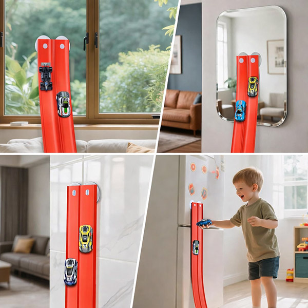 Uchytenie pomocou prísaviek umožňuje deťom aj rodičom rýchlo meniť uhly a rozloženie, takže dráhu možno opakovane prestavovať bez náradia alebo zložitej montáže.